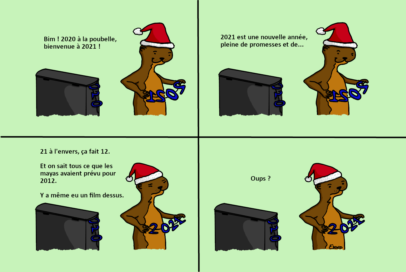 Bon, si l’on en croit l’année qui vient de s’écouler, j’ai bien peur que mes vœux ne soient pas aussi efficaces qu’un vaccin en ces temps pandémiques. Il faut dire que j’avais quand même prévu une catastrophe dans mes vœux de 2020, mais ce n’était pas quelque chose que j’espérais. Dans le doute, je vais arrêter de prédire de tels évènements ; le pouvoir de la déesse du Multivers est si puissant… Ceci dit, nous sommes passés à côté de la fameuse apocalypse zombie, donc tout n’est pas si mal, tu vois.